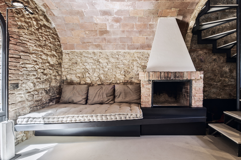 At the ground floor the imperfect squareness of the longitudinal walls is regularized by two lateral sittings, which are able to absorb the spatial discontinuity with their extension.