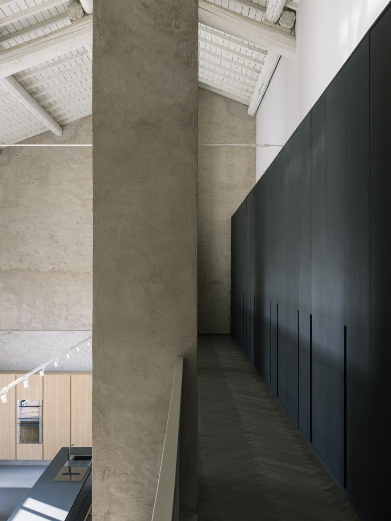 Al piano superiore una grande armadiatura si configura come parete contenitiva e come soglia d'accesso alle camere da letto e al bagno.
