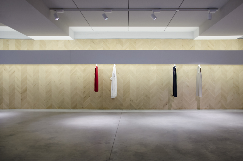 The concept store is characterized by the presence of a long display wall covered with oak herringbone that is shaped like the bottom of the exhibition space, a large skeletal desk made in oak sawn and a ceiling system consisting of bars that mark the extent of the space.