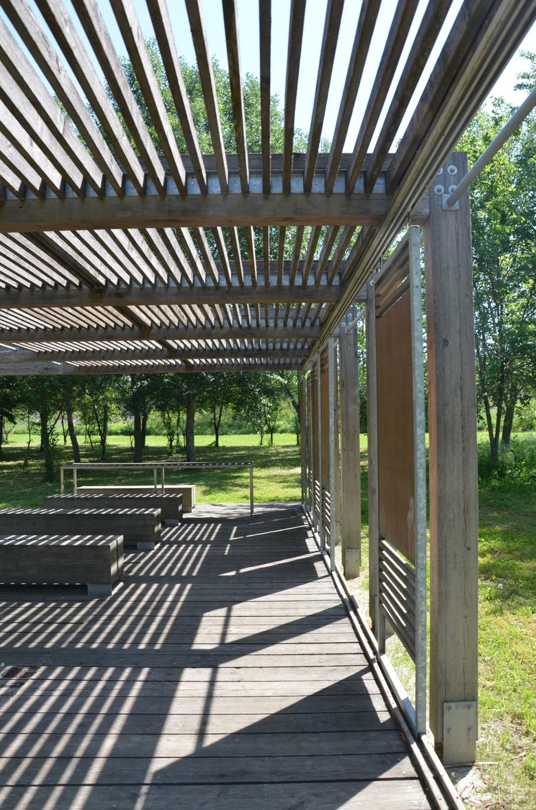 The architectural motif is defined by the relationship between the geometric space and the new wood. The structures establish different approaches with the natural environment: vegetable gardens, learning areas, rest and visitor orientation areas. Part of the details are made of sustainable resources; branches and cane-work colonize the weightless constructions and exploit the flexibility of the light.