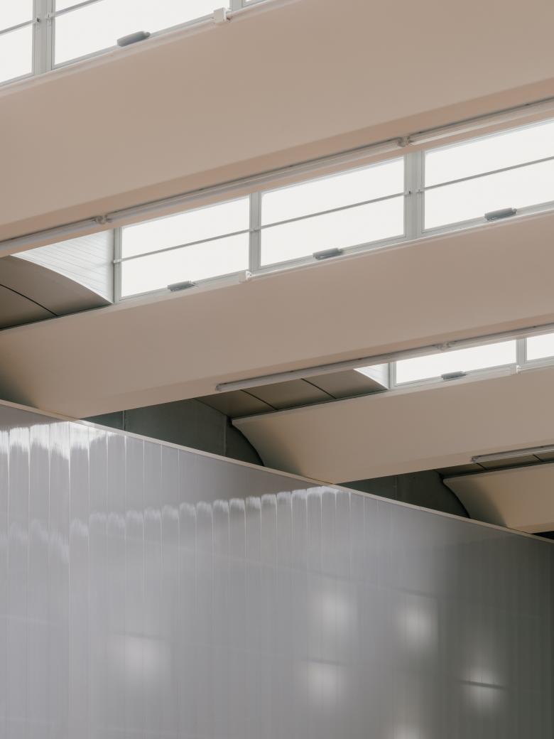 Inside, zenithal light coming from the north ensures uniform illumination of the space, while the openings along the longitudinal sides are shielded with polycarbonate walls that filter out direct sunlight from the playing field.