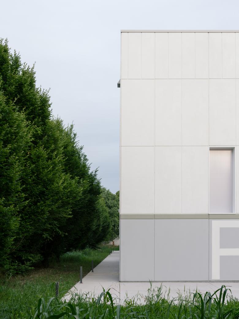 On the shorter side, a gradual abstraction of the façade elements occurs, culminating in the elevation facing the green system, where small irregular openings dematerialize the façade—except for one large selective opening oriented towards two symbolic landmarks of the community: the bell tower and the chimney.