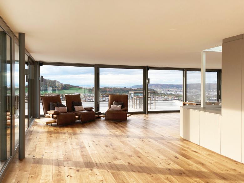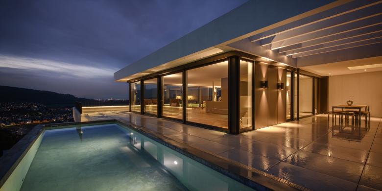 Die Wohnfläche ist auf dem höchsten Niveau und nach vorne platziert, um die Aussicht zu geniessen. Der Pool-Bereich ist nach hinten zum Wald gesetzt und bietet somit viel Intimität. Die Terrasse ist primär offen. Ein Bereich davon ist teils durch eine Pergola aus Sichtbeton gedeckt. Ein Bereich ist komplett mit einem grossen Oblicht gedeckt. So kann der Aussenraum in allen Jahreszeiten benutzt werden. Besonders interessant sind die Spiegeleffekte des Poolwassers an den weissen Betonbändern und am Fensterglas im Sommer.