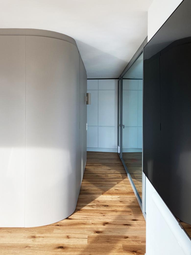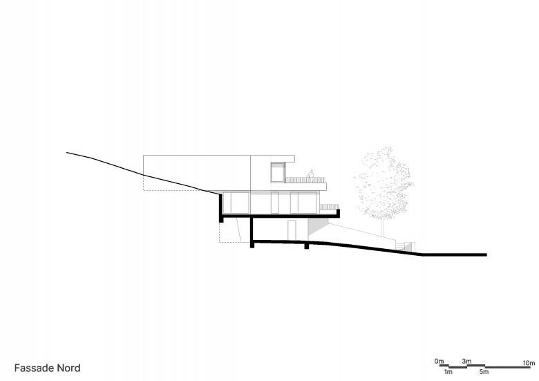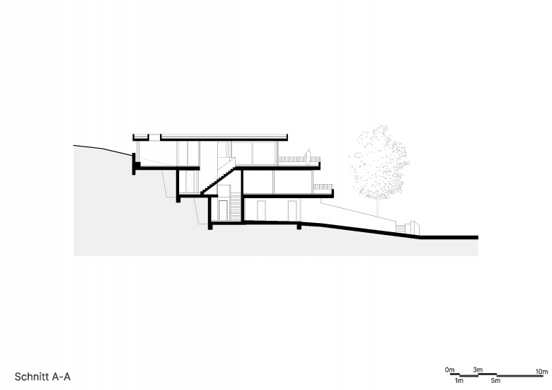 Das Einfamilienhaus befindet sich in einer Hanglage oberhalb des Rheins in der Nähe von Basel. Die Strassenfassade vom Bau wächst über drei Geschosse, hingegen die Rückfassade nur eins. Das Sockelgeschoss ist gegliedert mit der Garage, Eingangsbereich, Haustechnik/Pooltechnik und Weinkeller. Ein Lift verbindet das Erdniveau mit den mittleren und oberen Geschossen. Im mittleren Geschoss sind 3 Schlafzimmer, Ankleide,- und Badezimmerbereiche, sowie ein Waschraum angegliedert. Im obersten Geschoss befinden sich das Wohnen/Essen und die grosse Terrasse mit dem Pool. Dieses Geschoss geniesst eine tolle Aussicht über die Stadt Basel und den Rhein.