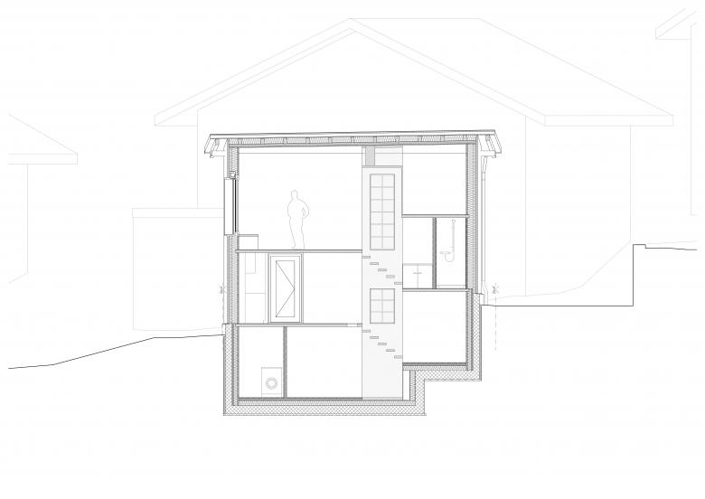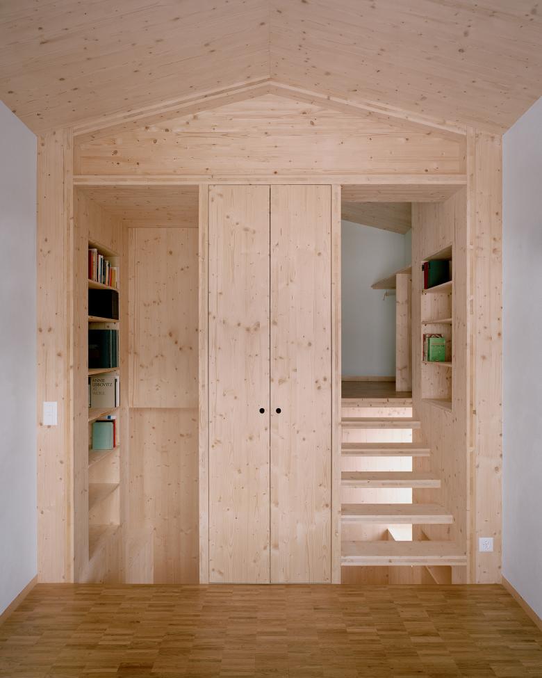 Die grosse Herausforderung lag darin, den begrenzten Raum möglichst effizient zu nutzen. Kern des neuen Einfamilienhauses ist ein Brettsperrholzturm, der die Halbgeschosse miteinander verbindet und gleichzeitig verschiedene Funktionen übernimmt. Der hölzerne Elementturm dient als Raumtrenner, Treppenturm, Steigzone, Kamin, Pelletslager und beherbergt über alle Geschosse hinweg Einbauschränke und Regale. Gleichzeitig übernimmt der Turm die statische Funktion einer Stütze und leitet die Lasten der Firstpfette in den Boden. Diese Nutzungskonzentration erlaubt es den Bewohnern den restlichen Raum frei zu Nutzen.