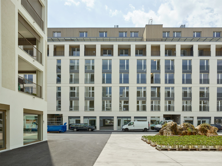Das Wohngebäude mit 65 2,5- bzw. 3,5-Zimmer-Wohnungen zeigt eine aufwändig mit Modellierputz gekämmte Fassade. Die Wohn/Ess-Bereiche sowie der Balkon sind nach Süden ausgerichtet und orientieren sich zum neuen Quartierpark, der als Treffpunkt und Erholungsgebiet dient.