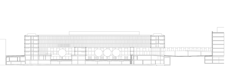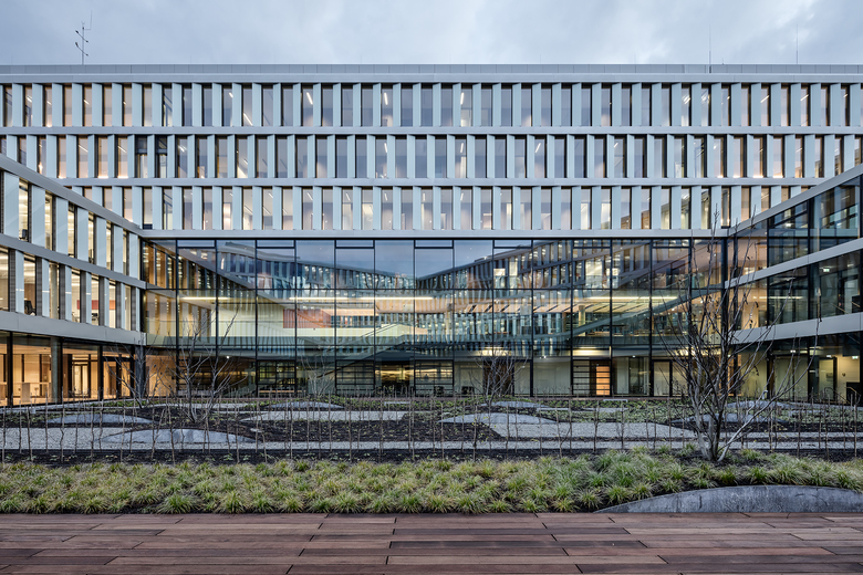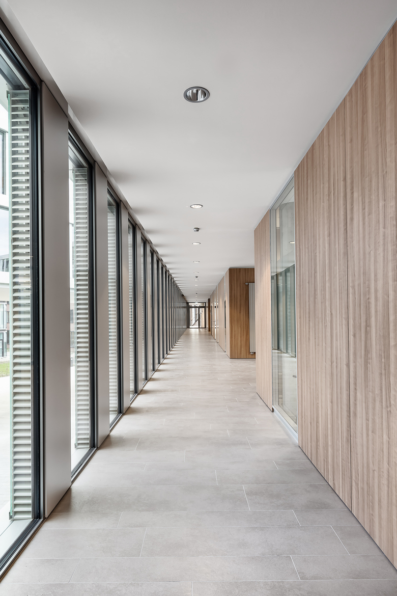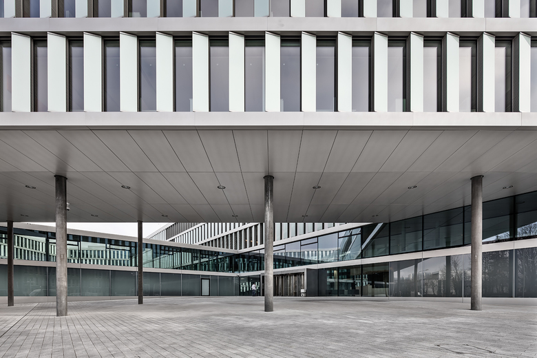Eine diagonal verlaufende Brücke, die das Bestandsgebäude der Hauptverwaltung des Versicherungskonzerns mit dem neuen Verwaltungsgebäude verbindet, bricht die Orthogonalität der Blockrandbebauung, die für den Neubau gewählt wurde. Die Störung wird zum Motiv und gibt die Ausrichtung der baulichen Verdichtung und Gliederung der Hofbereiche im Blockinneren vor. Das lebendige und zugleich homogene Fassadenbild wird bestimmt durch transluzente gläserne Blenden, die in regelmäßigen Abständen vor den Öffnungsflügeln der Fassade angeordnet und gegenüber der Gebäudeflucht leicht herausgedreht werden.