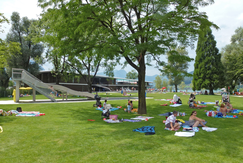 Ein Rundweg führt über das gesamte Gelände und verbindet das parkähnliche Seebad mit seiner Liegewiese sowie Kinderspielbereichen mit dem baumbestandenen Campingplatz und der Tennisanlage.