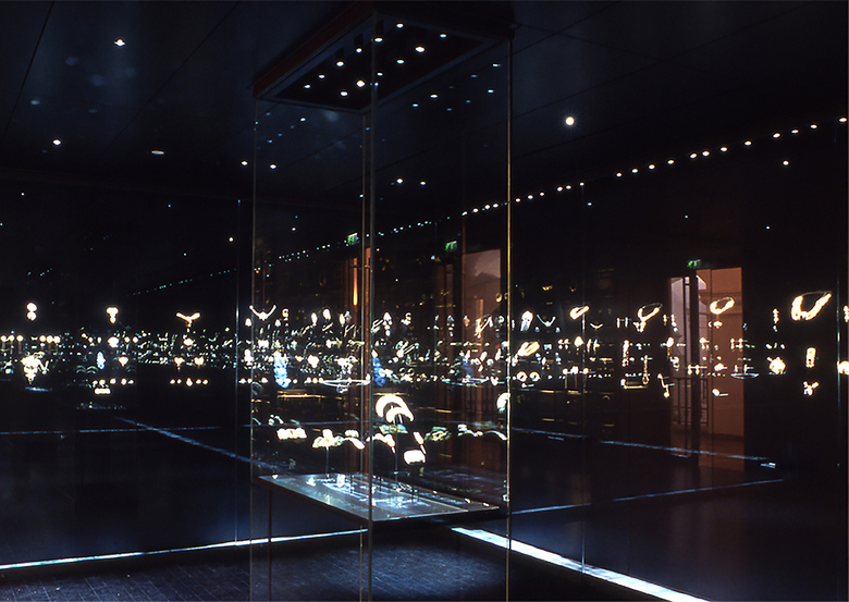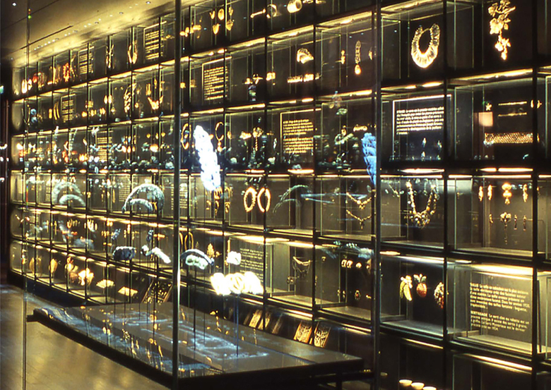 Das Design und die Signaletik in den Galerien lassen die Bauelemente verschwinden, die Schmuckstücke werden wahrgenommen wie wenn sie im Raum schweben würden.