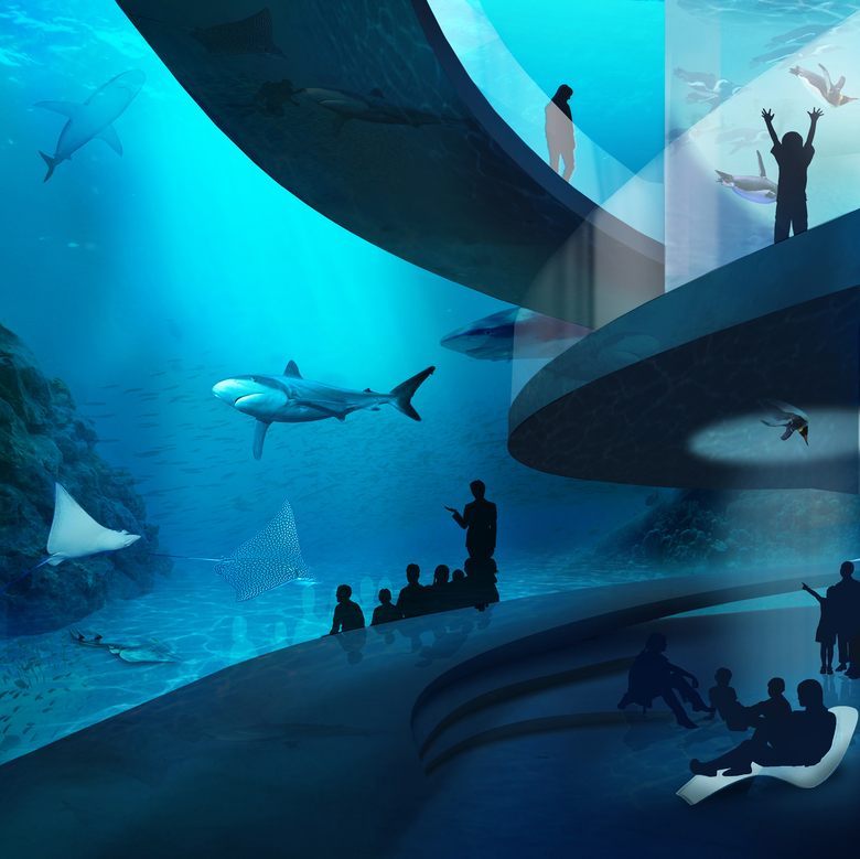 Ausserhalb des Geländes des Zoos Basel, erzählt die Szenographie des Ozeaniums die Geschichte der lokalen und der Meeres-Biodiversität. Gleich beim Eingang wird die Fauna und Flora des Rheinufers in Szene gesetzt. Der Besucher folgt dann dem Lauf des Flusses zu den Meeren und Ozeanen. Der Rundgang auf Rampen ist den Strömungen nachempfunden. Der Besucher folgt den kalten Strömungen in Richtung Meeresgrund und kommt mit den wärmeren Strömungen wieder an die Oberfläche zurück.