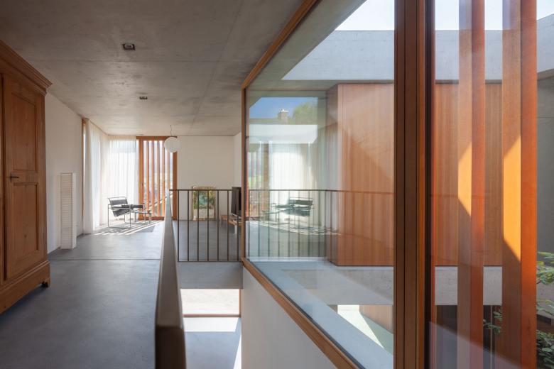 Alle Haupträume sind nach Süden, zur Aussicht und zum Garten hin ausgerichtet. Damit entsteht ein U-förmiges Gebäude, das einen Innenhof umschliesst, der das Zentrum des Hauses bildet, spannende Sichtbezüge schafft und die Wegführung innerhalb des Hauses bestimmt. Der Hof erlaubt trotz Hanglage eine mehrseitige Belichtung der Räume im Sockelgeschoss und einen starken räumlichen Bezug vom Eingangs- zum Sockelgeschoss.