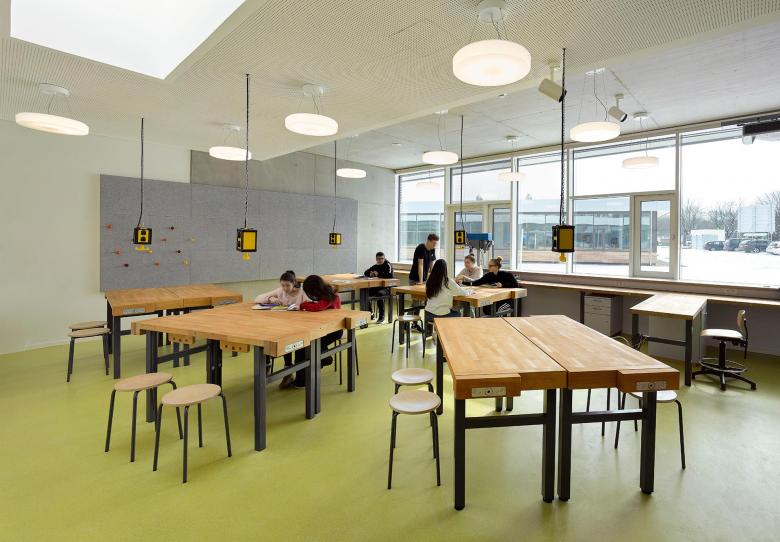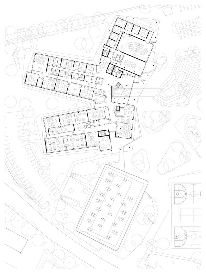 Der Haupteingang des Gebäudes befindet sich auf bodennahem Oberzugangsebene. Ein zweiter Eingang führt direkt in das zentrale Auditorium, das mehrere Stockwerke umfasst, wobei die verschiedenen Ebenen durch offene Treppen verbunden sind. Mit seiner nach Süden ausgerichteten Ausrichtung bildet dieser Raum das Herz des neuen Schulgebäudes. Die Idee der inneren zweistöckigen Treppe mit Sitztreppen entsteht außen in Form von Landschaftsterrasserie. Die Lehrerzimmer, die Schulverwaltung, den ganzen Tag, der Musikraum und die Bibliothek befinden sich direkt neben dem Auditorium im Eingangsbereich. Die Lehrräume befinden sich auch auf Eingangsebene und erstrecken sich in die Landschaft als „grüne Klassenräume“ in ihren eigenen Flügeln. Die kleinen, geschützten Bereiche zwischen den Flügeln haben spezielle Zonen für Kunst, Kunsthandwerk und Kochen.