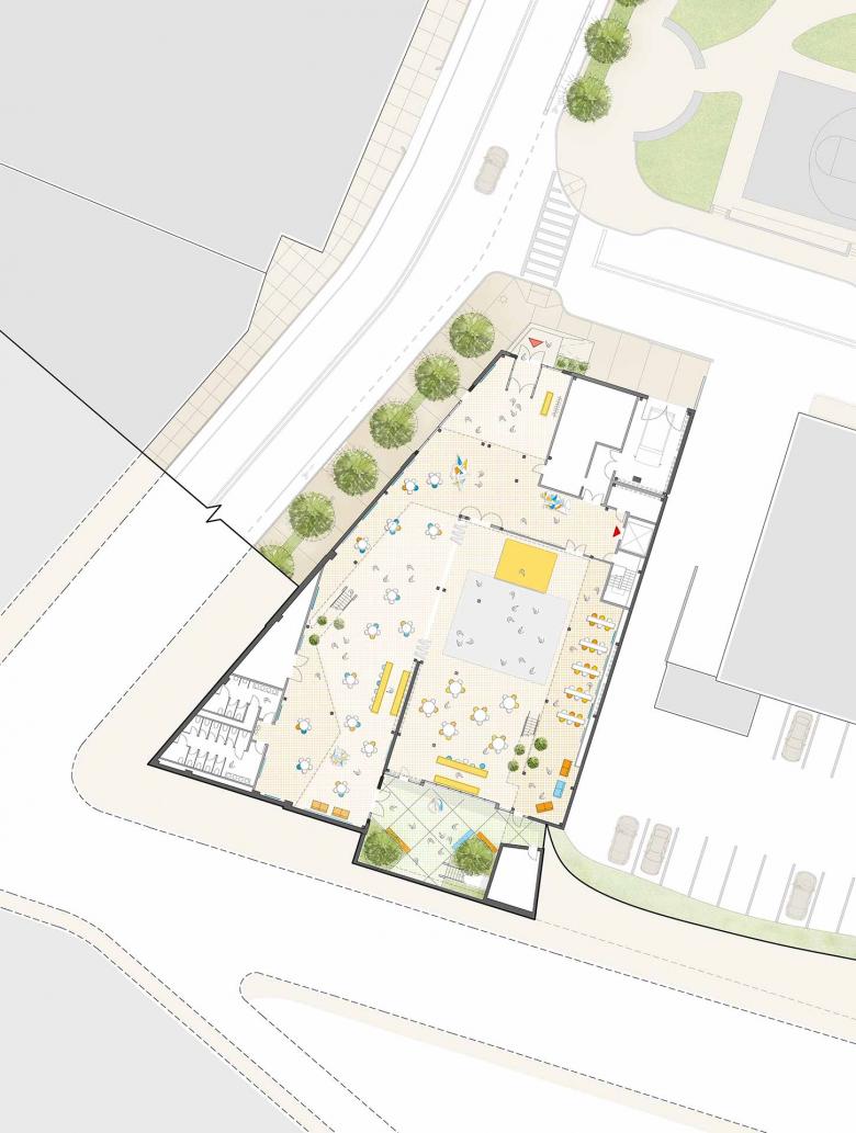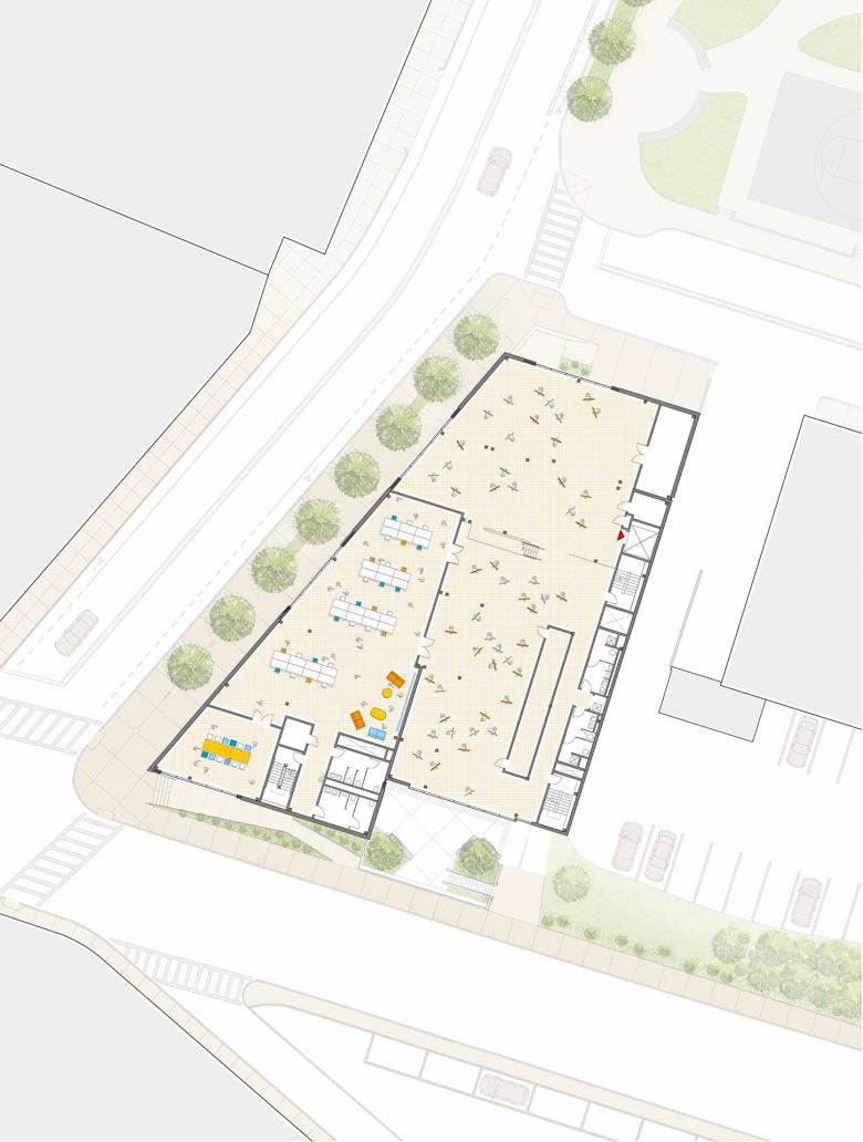 Durch die Integration markanter Eingangsbereiche auf beiden Seiten der Ausstellungs- und Veranstaltungsräume auf Straßenniveau kann der Erweiterungsanbau des EpiCenter nun von Norden und Süden erreicht werden. Eine einstöckige Abstufung zwischen den beiden Eingängen schafft einen Empfangsbereich für Ausstellungen und Veranstaltungen mit doppelter Deckenhöhe, der von einem umlaufenden Zwischengeschoss umgeben ist, das über eine offene Treppe zugänglich ist. Das zweite und dritte Stockwerk umfasst offene, loftähnliche Räume, die den vielfältigen Zwecken des beständig wachsenden Programms von AFH die nötige Flexibilität eröffnen. Die Veranstaltungsfläche im Erdgeschoss wurde renoviert und erweitert und bietet bei größeren Events nun die Möglichkeit die angrenzenden Ausstellungsräume mit zu nutzen.