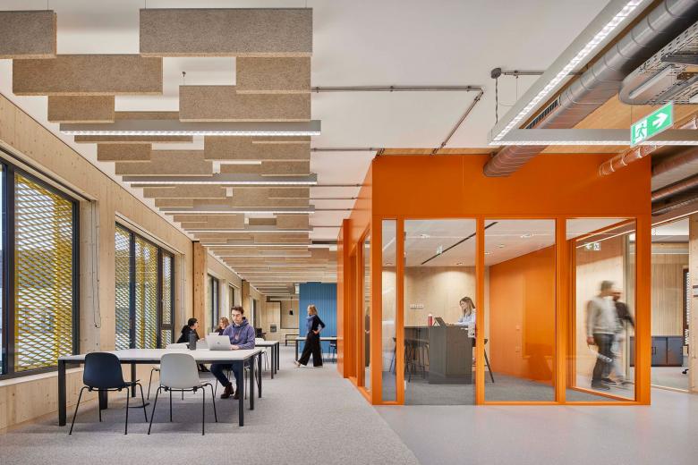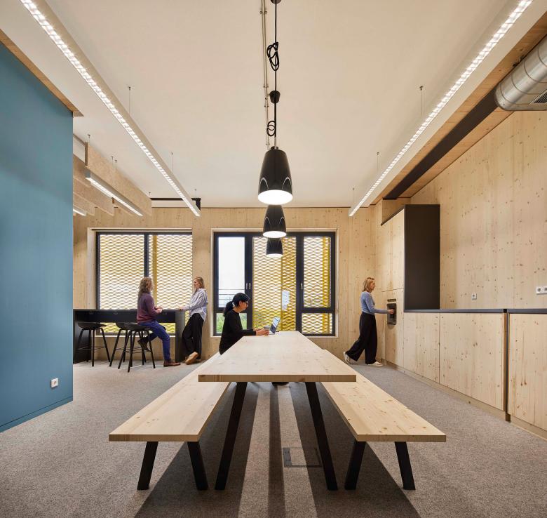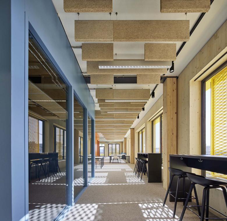 Mit nachwachsenden Baustoffen und ressourcenschonender Nutzung bestehender Infrastruktur hat die Fachhochschule Münster das Fachhochschulzentrum (FHZ) in der Corrensstraße erweitert. Behnisch Architekten plant in Zusammenarbeit mit Berghaus Architekten ein neues Obergeschoss im Holzbau, das das 1974 erbaute und 2014 sanierte und 2014 sanierte Gebäude ergänzt. Die Lehmdecke im Innenraum wirkt sowohl abkühlend als auch wärmend und regelt natürlich die Feuchtigkeit in den Räumen. Auf der Außenseite wird das Dach mit einer Photovoltaikanlage und zusätzlichem Grün bedeckt, das den natürlichen Wasserhaushalt bewahrt und die Artenvielfalt erhöht.
