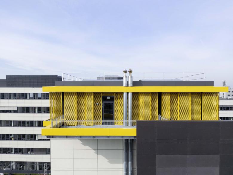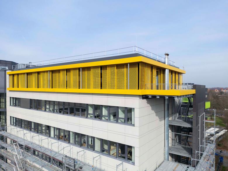 Der Ausbau bietet neue Büros für die Business-Fakultät sowie Freiräume und Kreativräume für alle Studenten. Die Münster UAS hat rund 592 Quadratmeter mehr Fläche an diesem Standort. Optisch wird der neue fünfte Stock durch eine markante Fassade mit festen Solarschattierungen aus expandiertem Metall abgegrenzt, was den Solarwärmegewinn im Sommer reduziert.