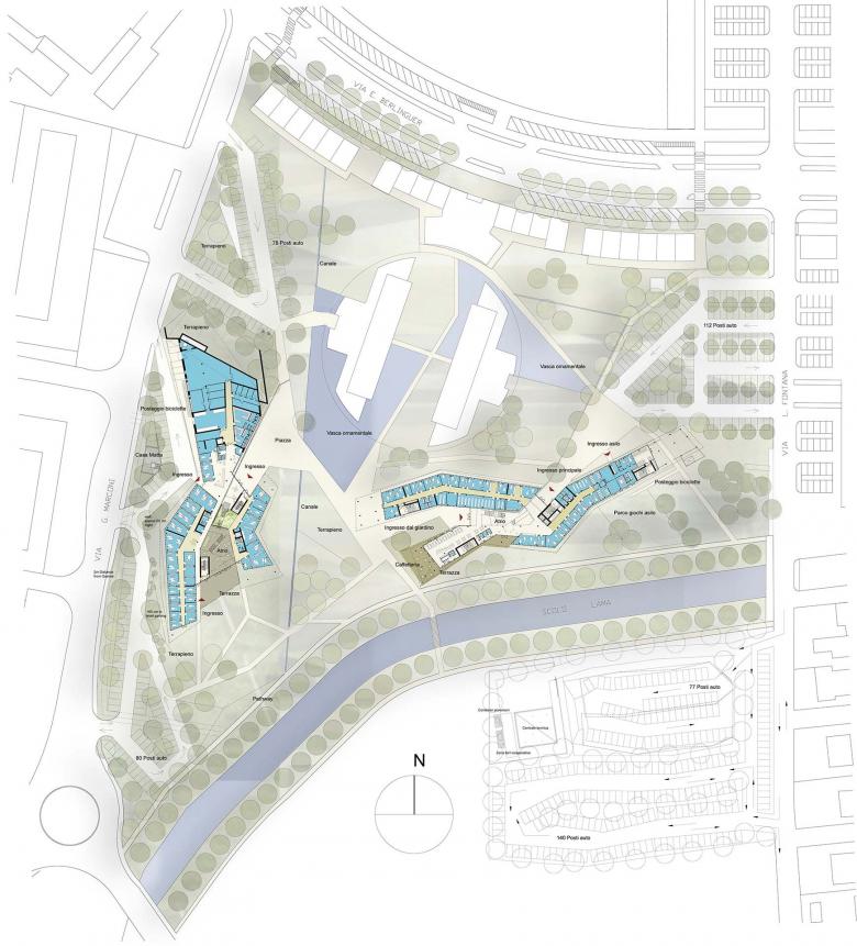 Das Brachgelände liegt in einem Übergangsgebiet an der Schwelle eines Wohnviertels. Zusammen mit einer neuen Schule auf einem Nachbargrundstück im Süden stellt das Projekt einen neuen Vorstadtfokus dar, einen neuen Park, der sowohl den Neuentwicklungen als auch der bestehenden Gemeinde zugute kommt.