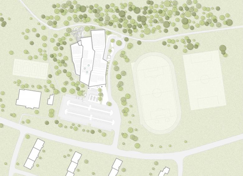 Im Innenraum zonieren die spannungsreich arrangierten Dachfelder die unterschiedlichen Beckenbereiche spielerisch, ohne den durchlässigen Charakter der Badelandschaft zu beeinträchtigen. Die Anordnung aller Becken ist maßgeschneidert auf die einzigartige Grundstückslage zugeschnitten. Im Zentrum lädt das Schwimmerbecken zum „Bahnen ziehen“ ein. Die angrenzenden Nichtschwimmer- und Kinderbecken sowie der Wasserspielplatz orientieren sich zur Fassade nach Süden. Hier befindet sich auch der Gastronomiebereich mit einer angegliederten Terrasse und Liegewiese im Außenraum. Badegäste finden sich in der ebenerdigen, eingeschossigen Badehalle einfach zurecht. Leichte Glastrennwände zonieren die Ruhebereiche, schirmen den Landebereich der Rutschen ab und schaffen für das Kursbecken sowie das zweite 25-Meter-Schwimmerbecken ein hohes Maß an Privatheit.
