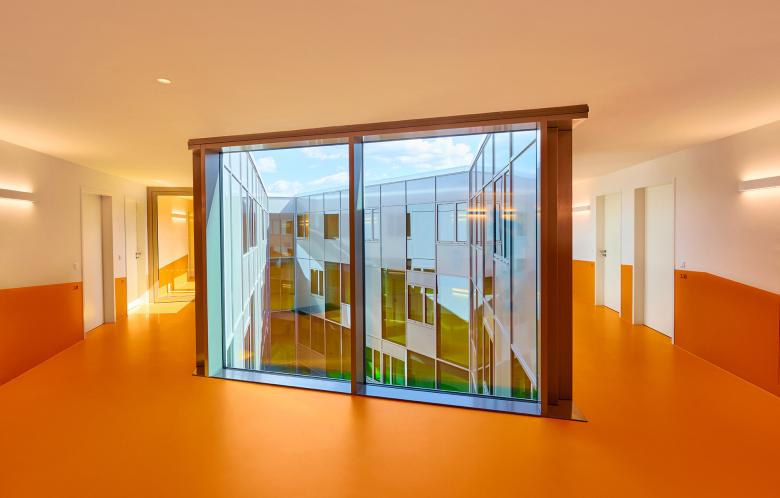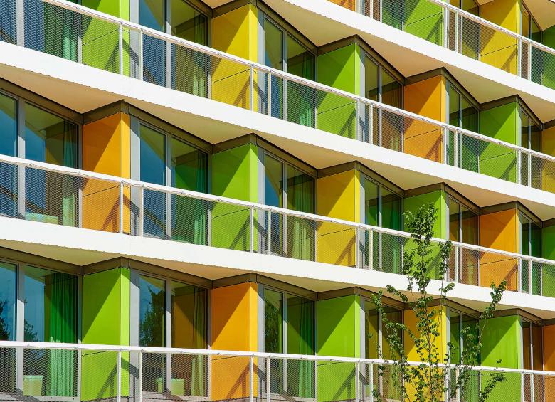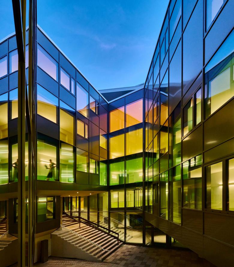 Die Wohneinheiten - mit insgesamt 204 Betten in 138 Einzelwohnungen, jeweils ca. 19 m2, 17 Gemeinschaftsräume für zwei Personen und 8 für vier Personen - mit Blick auf den Westen oder nach Osten. Die Zufahrtsbereiche, die sich an bestimmten Punkten verbreitern und entlang der Nordseite des Gebäudes zu einem zentralen Innenhof öffnen, der alle Etagen durchquert, wodurch natürliche Beleuchtung und Belüftung ermöglicht und noch ein weiterer Raum für Studenten bietet. Die geschlossenen Elemente der Fassaden reflektieren Tageslicht und Sonnenschein an den Seiten der gegenüberliegenden Gängen und werden in den unteren Stockwerken immer transparenter. Verschiedene Farbtöne auf den Böden und Wänden, gepaart mit Text- und Grafikelementen, helfen Besuchern und Anwohnern durch das Gebäude zu führen.