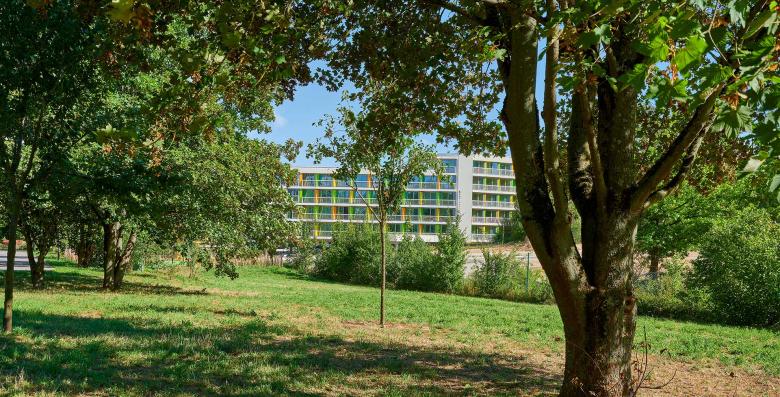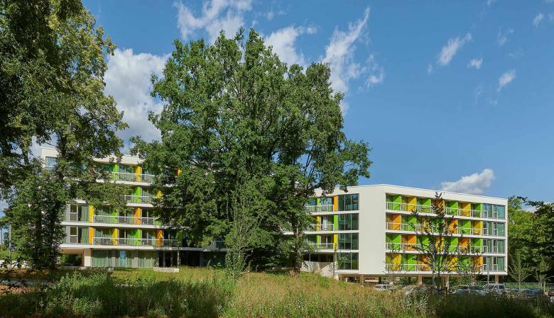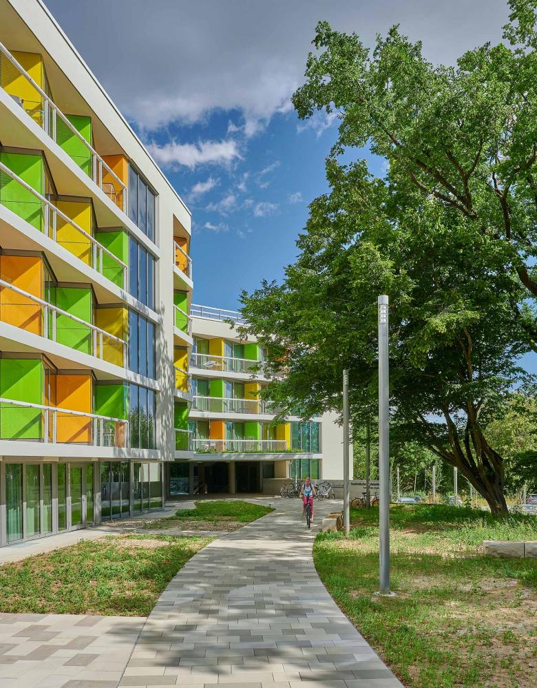 Das Gebiet mit den denkmalgeschützten Gebäuden in Regensburg ist für seine weitläufigen Grünflächen und schönen Altbäume bekannt. Für diesen Ort, der sich in der Nähe der Innenstadt befindet und in unmittelbarer Nähe zur Fachhochschule (OTH), der Universität und dem Universitätsklinikum liegt, hat Behnisch Architekten einen Wohnkomplex für 204 Studenten gebaut und soll mit der Natur harmonieren.