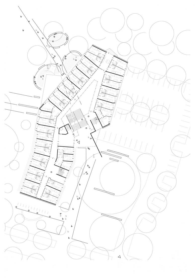 Kernstück hinter dem Entwurf war die Franz-Mayer-Straße im Süden mit dem Gebäude und dem Grünweg im Norden zu verbinden. Ein neu geschaffener öffentlicher Fußweg bietet das Hauptzugangsmittel und öffnet sich zu einer breiten und einladenden Treppe in der Nähe des Eingangsbereichs, die zu einem geschützten Innenhof führt und als Bühne für Veranstaltungen und andere Zwecke dient. Die öffentlichen Gemeinschaftsbereiche auf Gartenebene bieten Sitzgelegenheiten, einen Grillplatz und andere Freizeiteinrichtungen sowohl innerhalb als auch außerhalb des Gebäudes, so dass sich die Hektik des Studentenlebens ungestört abspielen kann. Grüninseln sind rund um den Ort eingebettet und bieten Studenten aus der ganzen Welt einen Raum, um sich zu treffen und zu unterhalten und so den Nibelungen-Komplex mit Leben zu füllen.