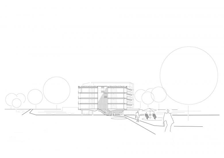 Die verzerrte axiale Ausrichtung des länglichen, fünfstöckigen Gebäudes, das entlang seiner östlichen Seite in der Höhe gestaffelt ist, ermöglicht es der Struktur, Abstand von der vorhandenen Eiche zu halten und hilft, einen markanten Eingangsbereich zu schaffen. Die Nordwestseite bietet zusätzlichen Platz für Premium-Freizeitflächen im Freien.