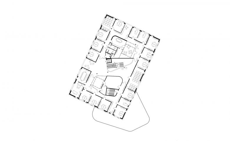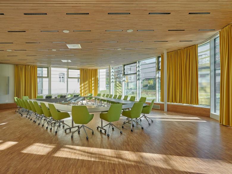 Das neue Rathaus mit dem neu gestalteten Platz und dem bekannten alten Rathausgebäude öffnen den Weg zuversichtlich in die neue Innenstadt. Wie es sich für ein wichtiges öffentliches Gebäude gehört, zeichnet sich das Rathaus durch seine Größe und Lage aus, aber es ist auch Teil eines Ensembles, das eine klare Beziehung zu den benachbarten Gebäuden hat. Die erste Geschichte beherbergt Dienstleistungen für die Bürger: Sie ist in zwei unabhängige Abschnitte unterteilt, mit einem Freiform-Design, das von einem Gefühl der Transparenz geprägt ist. Die beiden bodenständigen Abschnitte liegen inmitten eines großen Raumes, der für die öffentliche Nutzung bestimmt ist, und betonen auch das Thema des offenen Zugangs vom Rathausplatz zum Grünflächen im Westen. Auf der einen Seite befindet sich das vielbeschäftigte Büro für Bürger, darunter das Foyer und eine offene Treppe, die zur oberen Geschichte führt. Auf der anderen Seite gibt es den Ratssaal und den Raum für Hochzeitszeremonien.