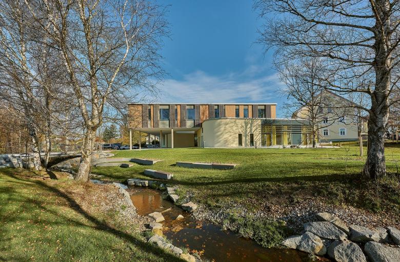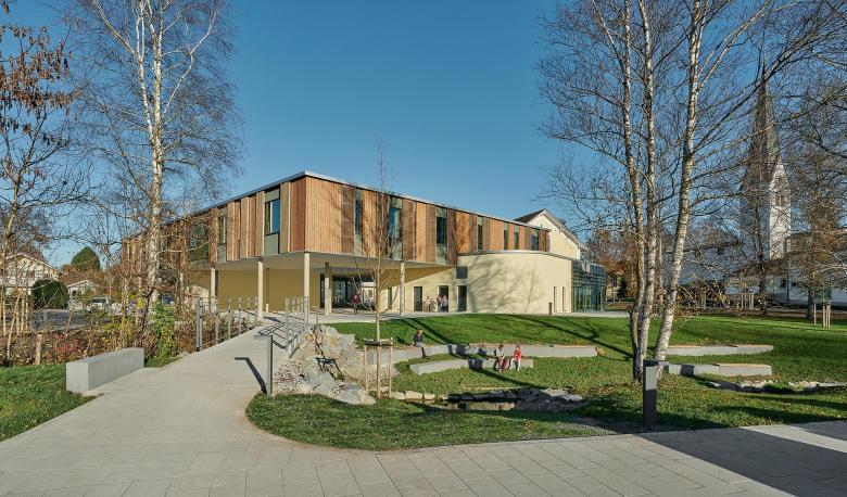 Großkarolinenfeld, nördlich der Stadt Rosenheim, hatte zuvor ein klar definiertes Zentrum gefehlt. Ein Netzwerk neu gestalteter Grünflächen, öffentlicher Plätze und Wege schafft einen effektiv integrierten Stadtraum. Der neue Rathausplatz liegt zwischen den alten und den neuen Rathausgebäuden, eine Route durch die Freifläche, die zu den Grünflächen rund um den Erlbacher Bach nach Südwesten führt. Dieser öffentliche Weg durch das Gebäude verbindet den Platz über eine Fußgängerbrücke mit Spielplatz und öffentlichem Festgelände. Die angrenzenden Rathausgärten umfassen großzügige Steppsitze für Ruhe und Entspannung.