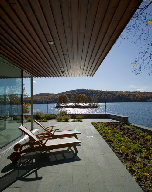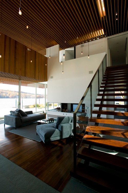 Wedged into a tight lot along Lake Candlewood in New Fairfield, Connecticut, this new home’s form and structure was derived from observations of trees and an adaptation of local building techniques. The project began with studies of leaf canopies, accumulated ring structures, and the dappled light that filters through groups of trees. Multiple study models in several media (concrete, acrylic, wood, plaster), investigated how light flows through perforations in these various materials. We used these models to observe, secondarily, how certain materials would be suited to creating a stable, discrete, but minimal structure. During the formative process we were interested in designing a house that seemed in large part to float and protect, much like the tree canopies on the site shelter the ground beneath them. The final design, a house of 5400 square feet, involved an intense collaboration with Guy Nordenson and Associates, Structural Engineers. Together we developed a unique structural system of long-span ¾” x 16” x 27’ plywood joists which work in tandem with a series of steel Verendiel trusses that rest on solid billets of steel. The joists, made from scarf-jointed Douglas fir, assembled into 4’ wide panels using steel stiffening pipes to join and stabilize the plywood before being lifted into place. The slim columns on which the steel truss structure and this joist system rest support the cantilevered volumes which are clad in red cedar. This cedar is deployed on the exterior in two different techniques: First, it is installed with a vertical board and batten technique to exaggerate the appearance that the house was assembled as a series of stacked pieces, like the rings of a tree. On obverse faces the wood is installed in a jointless tongue and groove fashion. Organized around the central double-height volume spanned by the special long-span wood joists, the ground floor is primarily wrapped in monumental sliding glass panels, opening up the house and connecting the inside, quite literally, to the outside. The mobility of these panels exaggerates the weight of the two cantilevered volumes above. Upstairs, two cantilevers contain the bedrooms. These spaces jut out over the lake like the prow of a boat and protrude into the surrounding trees themselves. Carefully located skylights illuminate the great room and each of the upstairs spaces, as if light were coming through gaps in tree branches.