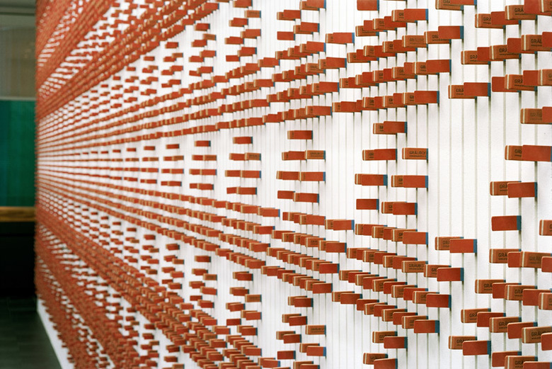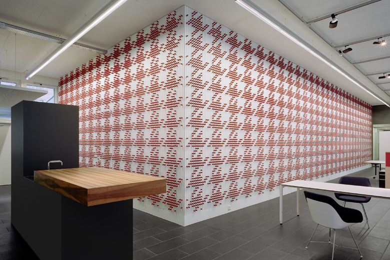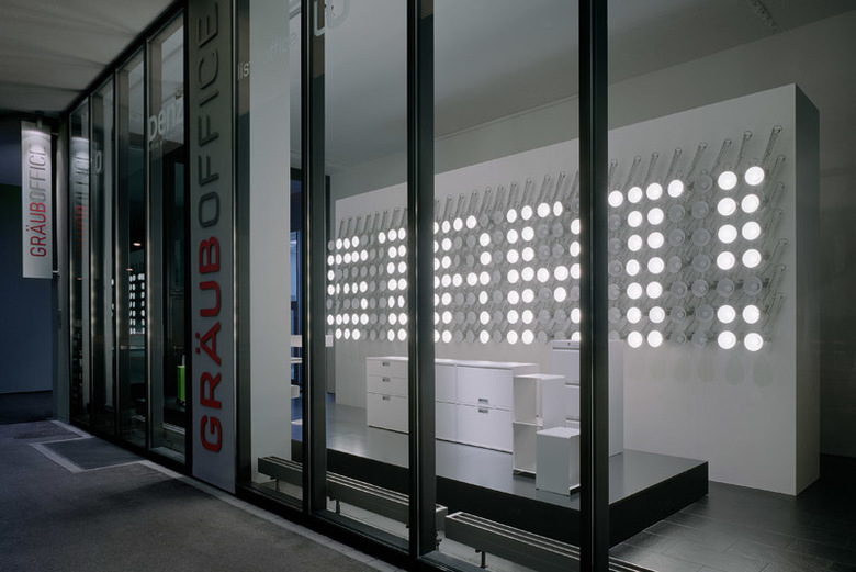Das Raumkonzept von Bureau Hindermann verbindet die zentralen Bereiche Ausstellen und Arbeiten miteinander. Im Arbeitsbereich herrscht durch die Materialisierung und das Licht eine nahezu wohnliche Atmosphäre vor. Der überdimensionale Blumentopf mit dem Gummibaum ist nicht nur eine augenzwinkernde Reminiszenz an die einst beliebteste Zimmerpflanze, sondern vor allem ein optischer Anziehungspunkt für die Kundschaft. Das Ziel des Entwurfes für Gräub Office war es, über die rein funktionalen Anforderungen, wie persönliche Besucherführung, grosse Ausstellungsflächen, stimmungsvolle Arbeitsplätze und flexible Nutzungsmöglichkeiten hinaus starke, unverwechselbare Bilder und Eindrücke zu vermitteln, die auch im Nachhinein mit Gräub Office in Zusammenhang gebracht würden. Dazu tragen das Schaufenster mit der Büroleuchteninstallation, die überdimensionale Zimmerpflanze sowie die Wand mit den 25'000 Bürogummis bei.
