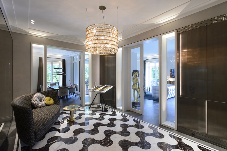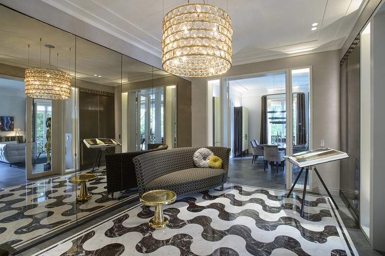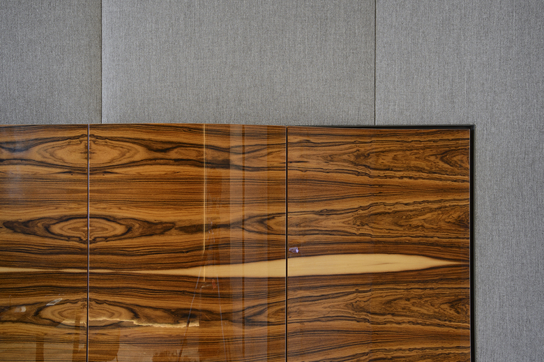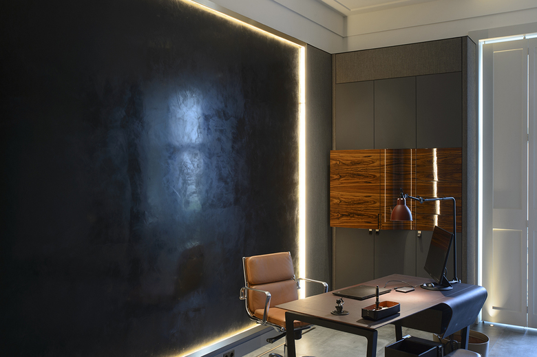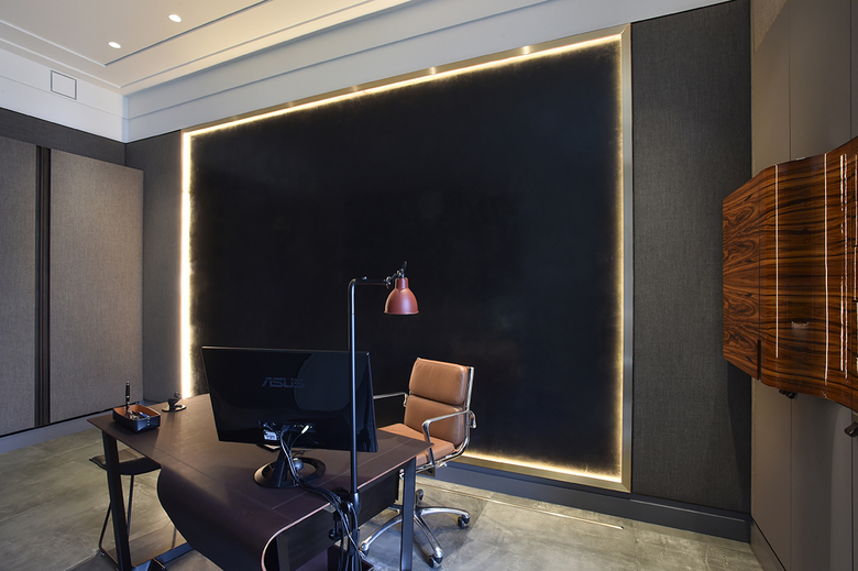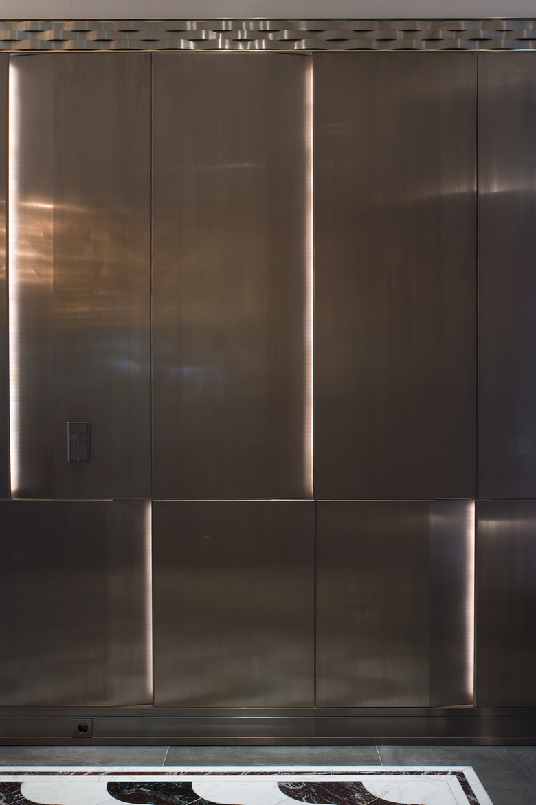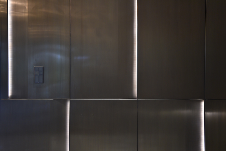 In enger Abstimmung mit dem Auftraggeber erfolgte die Konzeption und Realisierung hochwertiger Einzel- und Einbaumöbel, sowie die Ausführung raumprägender Wandverkleidungen - immer bezogen auf die jeweiligen nutzerspezifischen Anforderungen der verschiedenen Raumsequenzen. In Zusammenarbeit mit ausgewählten Handwerksbetrieben konnten so edle Unikate geschaffen werden, die den gewollt repräsentativen Charakter der Funktionsbereiche unterstreichen. Hier sind besonders die stoffbezogenen Wände mit Metalleinfassung im Arbeitszimmer und die Metallwand im Entree hervorzuheben. Die aufgehenden Wände wurden unter anderem mit mehrfach gekanteten und indirekt beleuchteten Paneelen aus gebeiztem Metallblech verkleidet. Das Pendant bildet eine bronzierte Spiegelfläche, hinter der die gesamten haustechnischen Anschlüsse und Verteiler unsichtbar verschwinden.