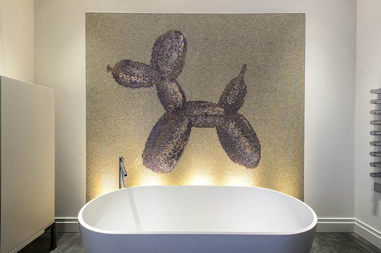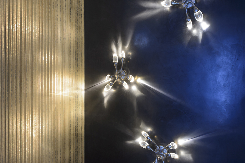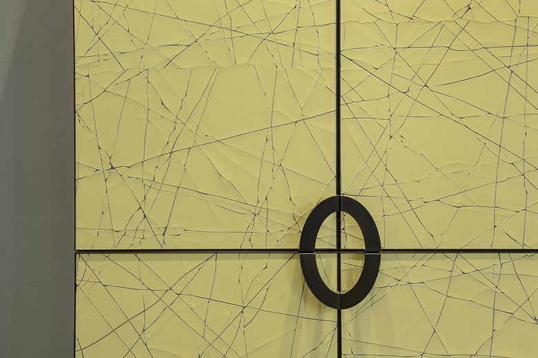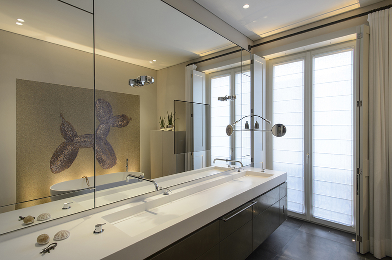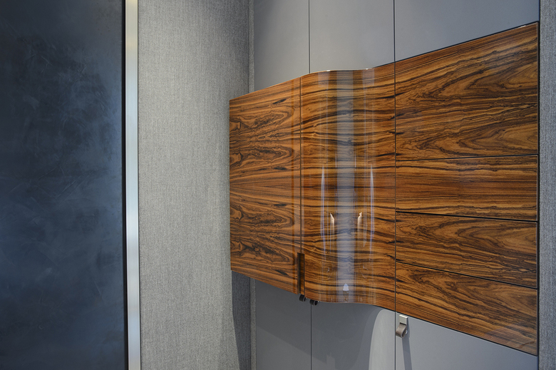 Weitere bronzierte Metallflächen und -lisenen finden sich sowohl an den handwerklich gefertigten Schränken im Esszimmer, hier mit einer Krakelee-Oberfläche ergänzt, oder am Waschtischunterbau im Masterbad, hier im Zusammenspiel mit einer platinfarbenen Metallspachtelbeschichtung. Die Metallanmutung zieht sich als Leitmaterial durch die gesamte Innenausstattung, immer wieder im Kontext ganz unterschiedlicher Werkstoffe und Oberflächen.