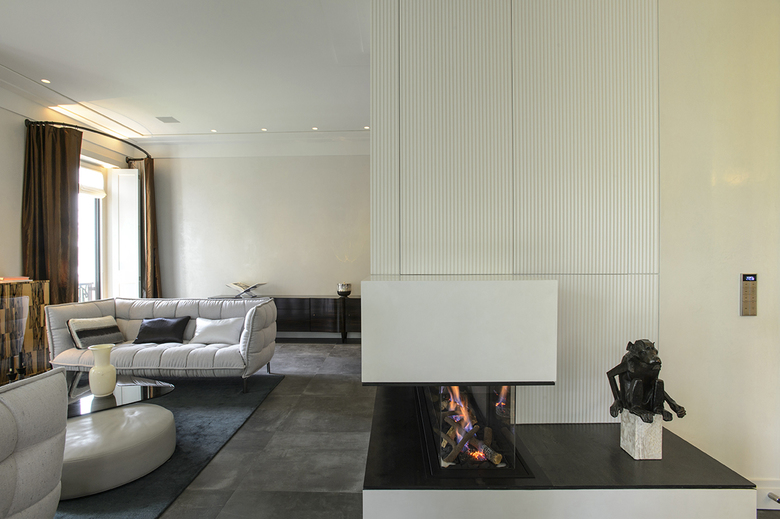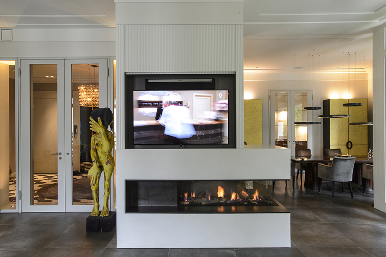 Im Ess- und Wohnbereich bildet ein dreiseitig einsehbarer, möbelintegrierter Gaskamin das Zentrum des familiären Lebens, mit der Besonderheit, dass der integrierte Flatscreen auf Knopfdruck hinter den flächenbündigen Wandpaneelen verschwindet.