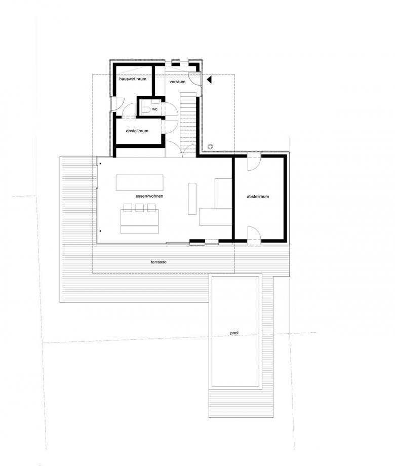 Das Familienleben spielt sich zwischen Wohnen und Kochen im Erdgeschoß und Schlafen und Relaxen im Obergeschoß ab. Ein zusätzlicher multifunktionaler Raum im Dachgeschoß erstreckt sich mit rundum Blick hoch über die Nachbarn. Die verschiedenen Nutzungsbereiche der noch 3-köpfigen Familie spiegeln sich in drei unterschiedlich ausgeformten, gestapelten Volumina wider, die zueinander verschoben wurden.