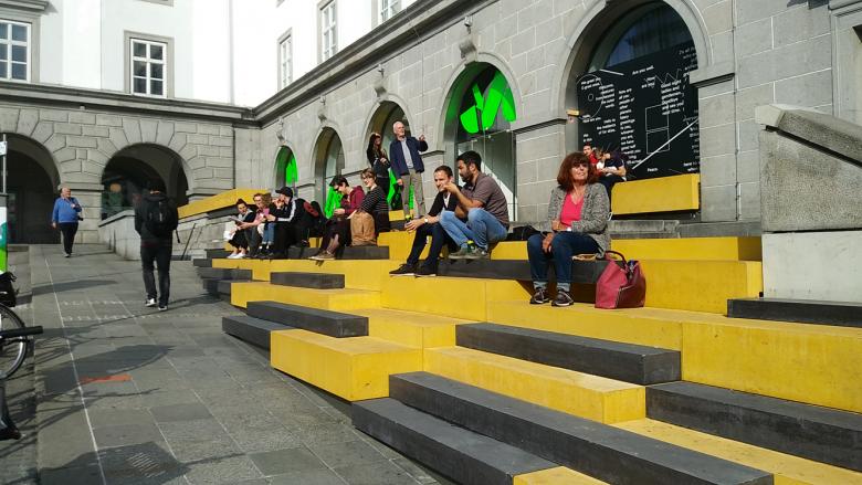 Rund 60 farbige Betonquader in den Farben Schwarz und Gelb zieren den Vorplatz der Kunstuniversität Linz am Hauptplatz. Von „Caramel Architekten“ entworfen, soll das Geschenk der Kunstuniversität Linz an alle LinzerInnen zum Verweilen einladen und gleichzeitig die Sichtbarkeit der Ausbildungsstätte im urbanen Raum stärken. Inspiriert von den temporären Sitzstufen an gleicher Stelle bei „Linz 09“, damals ebenfalls aus der Feder von Caramel, soll diese neu entstandene Form der Stadtmöblierung die Kunstuniversität Linz sowie das „splace am Hauptplatz“ zum Hauptplatz hin öffnen – und umgekehrt.