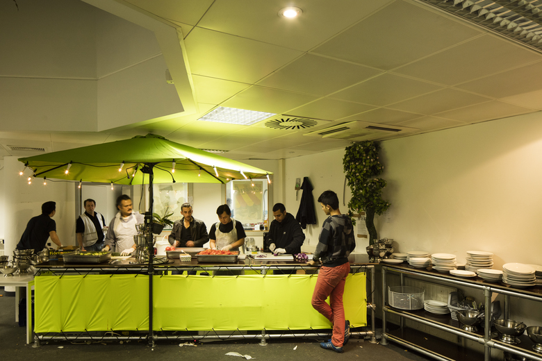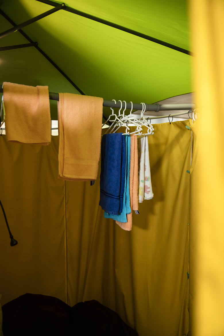 Für 280 Flüchtende wurde in einem vorübergehend leerstehenden Grossraumbürogebäude mit Materialkosten von 50 € pro Person und einer Aufbauzeit von 50 Minuten pro Person individuell aneigenbare Privatsphäre geschaffen. Aus den günstigen ready-made Produkten Sonnenschirm, Bauzaunständer, Elektroleerrohren, steckbaren Kunststoffwasserrohren,
