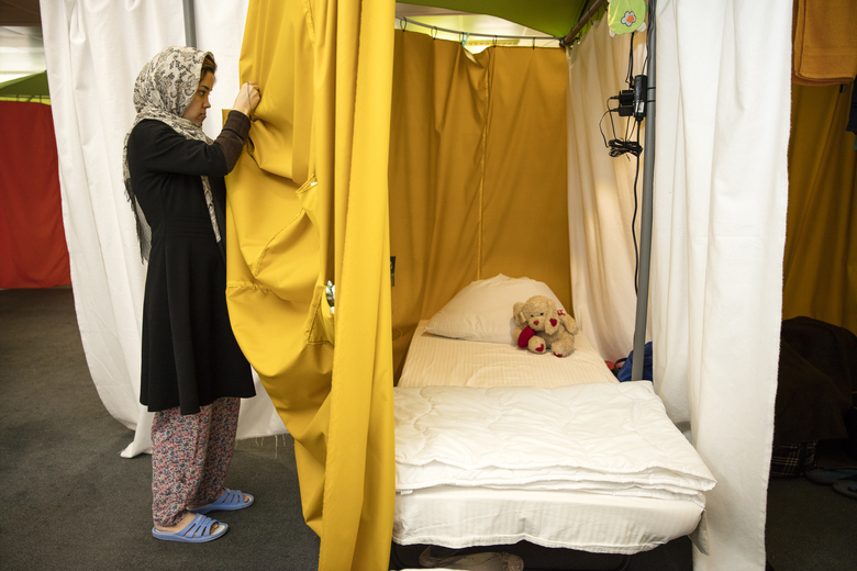 Erster persönlicher Rückzugsbereich nach Monaten auf der Flucht und der Unterbringung in Massenlagern. Selbstgewählte Grundrissgestaltung des eigenen Wohnumfeldes. Individuelle Lichtatmosphäre durch die eigene Klemmleuchte und die räumliche Abschirmung gegen die Bürorasterleuchten der Bestandsdecke.