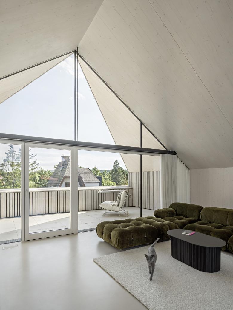 Das als Multimedia-, Arbeits- und Musikzimmer konzipierte Obergeschoss bietet straßen- und gartenseitige teilweise überdachte Terrassen. Auf der Gartenseite gibt es anstelle eines Geländers zur unteren Terrasse eine bodenebene „Hängematte“. Hier schweift der Blick über die Bäume und über die Weinberge bis nach Wien. Eine Reminiszenz an die alte Dachgeschosswohnung der Wiener Zeit. Auch von hier führt eine Außentreppe auf die untere Terrasse und von dort direkt in den Garten.