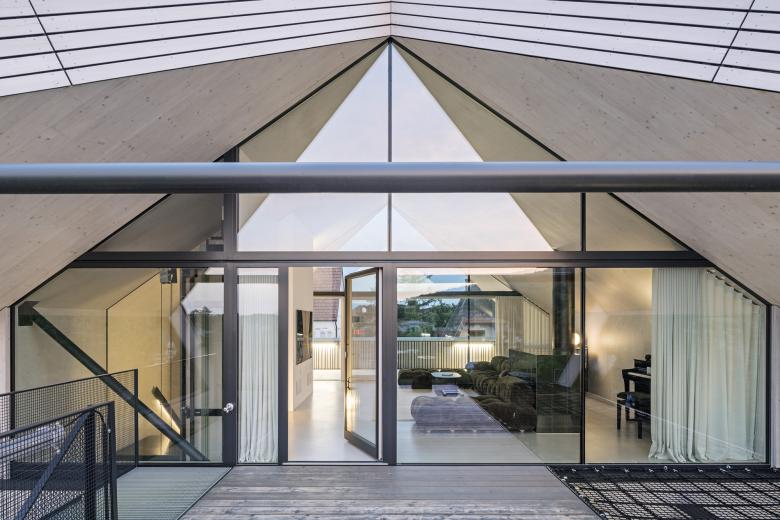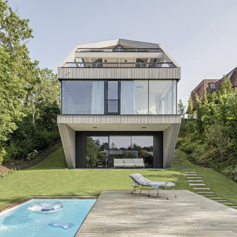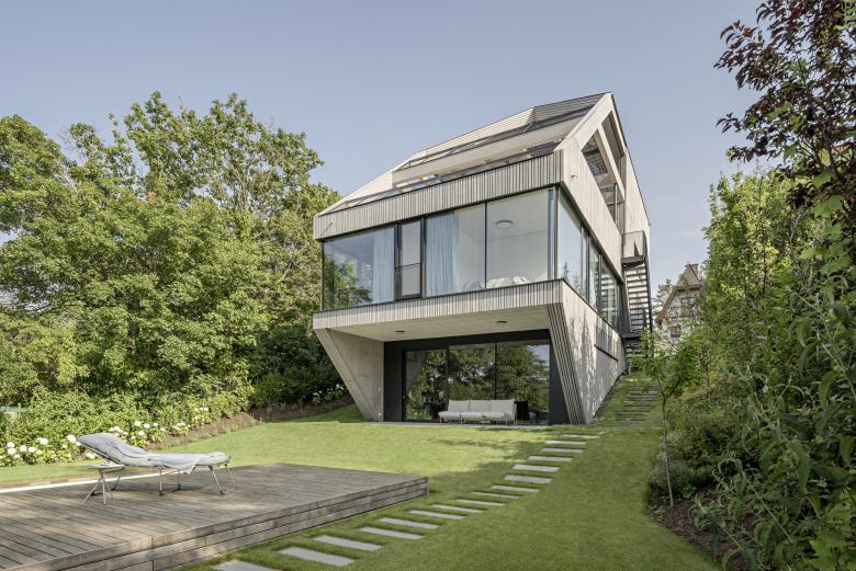 Auf der Straßenseite orientiert sich das Haus an den Nachbarhäusern mit ortstypischen Satteldächern, interpretiert das Dach jedoch als teilweise überdachten Außenraum neu. Dort wirkt das große Einfamilienhaus zurückhaltend und fügt sich in die Tektonik der Straßenfronten der Nachbarhäuser ein. Zum Garten hin wächst das Haus jedoch imposant aus dem Hang heraus und öffnet sich zur Landschaft.