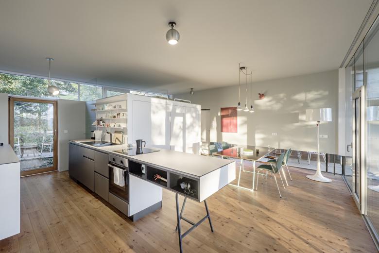 Die interne offene Treppe, die vom Studio bis zur obersten Etage führt, wird von einem offenen Glasaufzug begleitet. Im Obergeschoss liegt der Ess-, Küchen- und Wohnbereich, der sich zur Gartenseite hin zu einer großen, teilweise überdachten Terrasse mit Blick in Richtung Perchtoldsdorfer Heide öffnet. Eine Außentreppe führt direkt in den Garten mit Pool und Gästehaus. Zur Straße hin liegt der Küchenbereich mit einer versteckten Vorratsküche und einer Frühstückstheke.