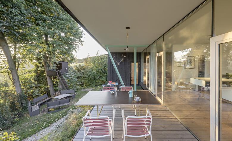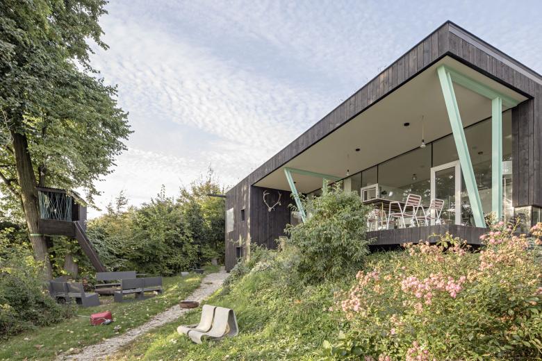 Um der Hektik der Wiener Innenstadt zu entfliehen, wünscht sich eine vierköpfige Familie ein Domizil im Grünen, in dem auch ein großzügiges Künstleratelier untergebracht werden soll. Man findet den perfekten Hangplatz. Die Beschaffenheit des Grundstücks lädt förmlich zur Stapelung der unterschiedlichen Wohnwelten ein. Dadurch entsteht im Untergeschoss das 3 Meter hohe Künstleratelier, teils an den Hang geschmiegt, teils auf gleicher Höhe mit dem Garten. Die überdachte Terrasse wird auch als Außenstudio genutzt.