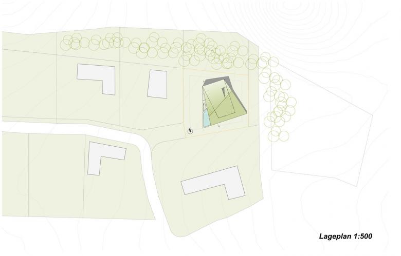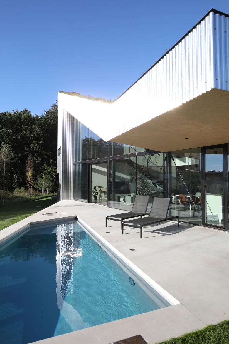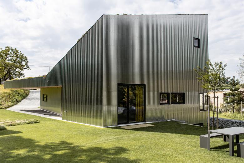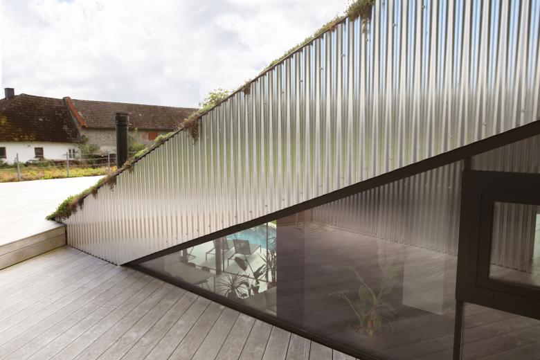 Ein großzügiges begrüntes Dach als ausgeschnittene und hochgefaltete Landschaft bildet das größte raumbildende Element des Hauses. Die Leichtbauholzkonstruktion mit hinterlüfteter Metallfassade und großflächige Glaselemente bilden die restlichen Außenhautflächen. Der Verschnitt des massiven Terrassenplateaus mit der Geländekante bildet nur partiell eine Anpassung an die Topographie, daher hebt sich der Baukörper nord-/westseitig aus dem Gelände.