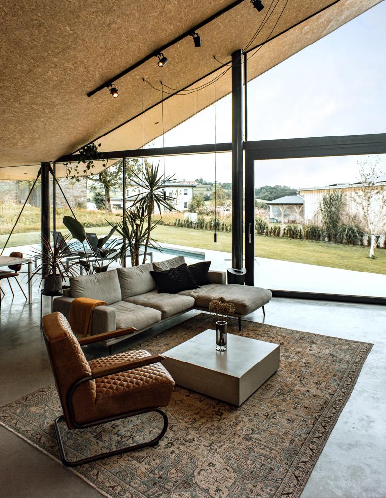 Das Herzstück des Hauses bildet der teils fünf Meter hohe, ebenerdige Wohnraum, von welchem sämtliche Räume, der Garten und das Terrassenplateau mit dem Pool erschlossen sind. Als baulich abgeschirmter Raum liegt der zeltartige Schlaf- und Ruhebereich im Obergeschoss und ist durch einen Einschnitt im Gründach mit der Dachterrasse verbunden. Fließend gehen Räume und Oberflächen ineinander über. Sei es der dreiseitig offene Kaminofen zwischen Wohn- und Arbeitsraum, der aus der Wandverbauung herauswächst und den Einblick durch die Brennkammer ins Arbeitszimmer erlaubt, oder der Betonboden und die Untersicht des Daches, die sich beide durch die rahmenlose Glasfassade von innen nach außen weiterziehen. Das Einbeziehen der Natur und Umgebung wird durch diese nach außen fließenden Übergänge noch einmal mehr betont.
