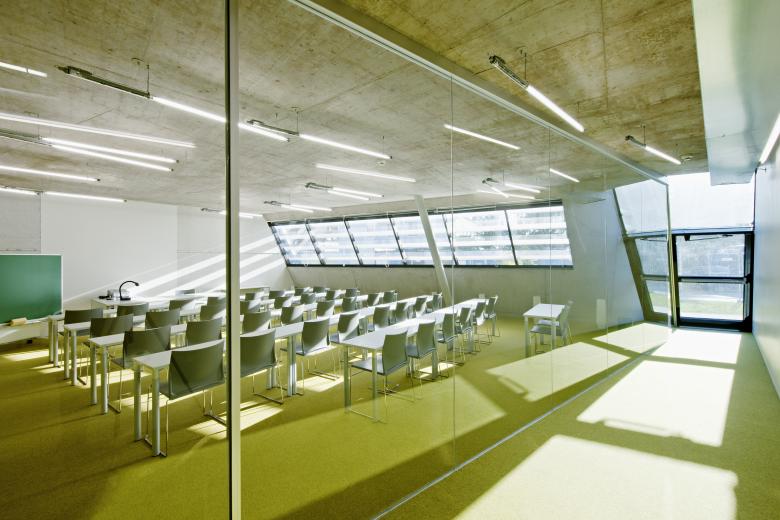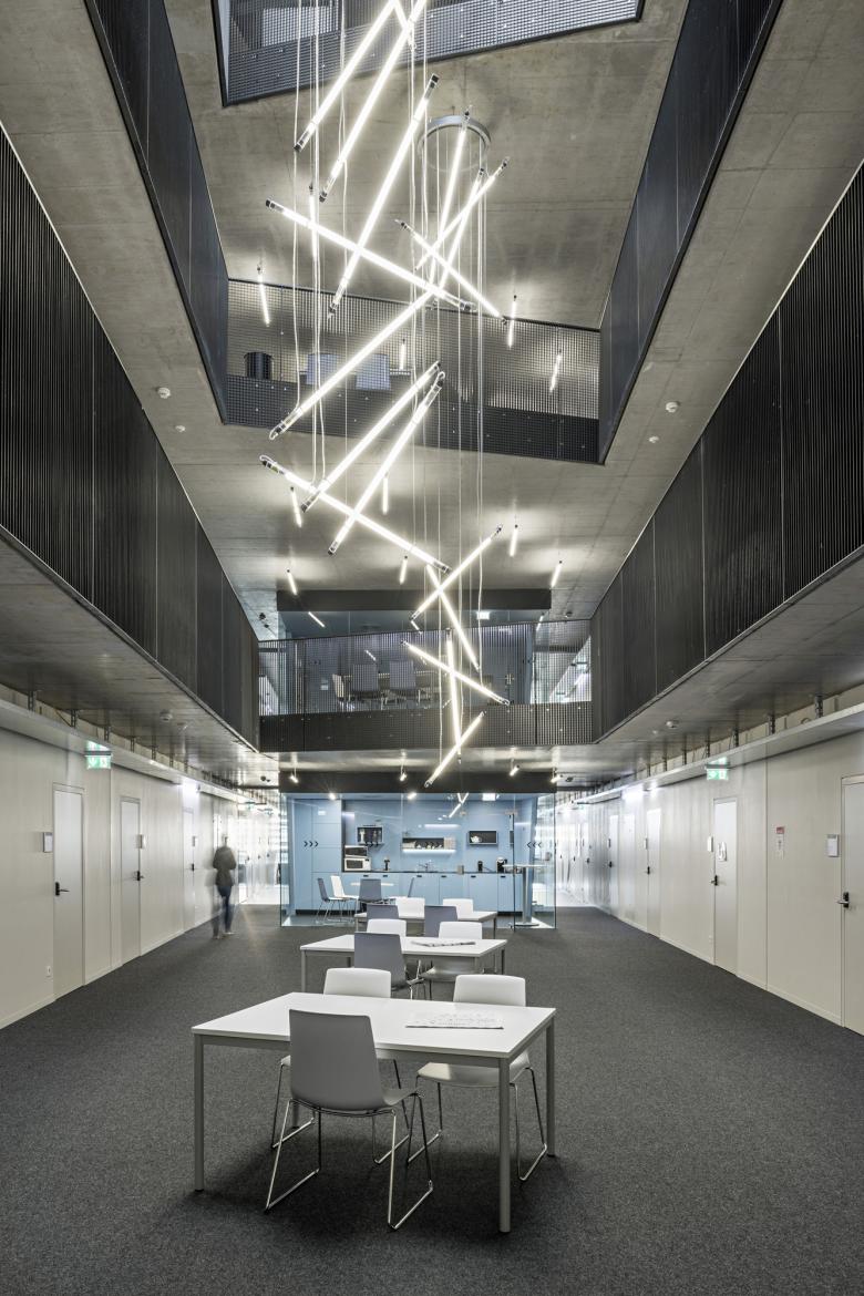 The spacious glazed interior atriums connect the floors with each other, allow light to fall into the lower levels and thus call for a new science working atmosphere of communication.
