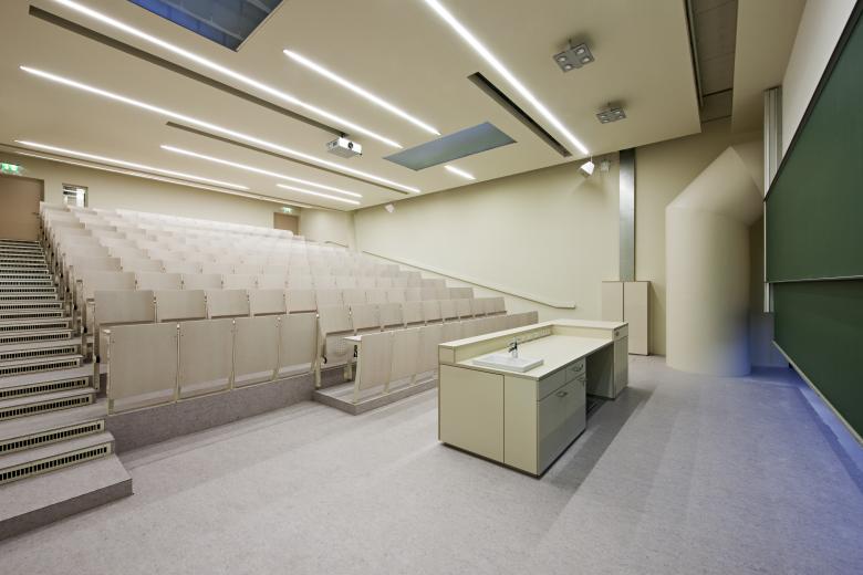 In addition to classic institute rooms, a research hall on the ground floor, a seminar wing (whose lecture hall can also be used as a rehearsal room for the university's own wind orchestra thanks to some acoustic tricks), component 4 also has multifunctional open-plan areas.