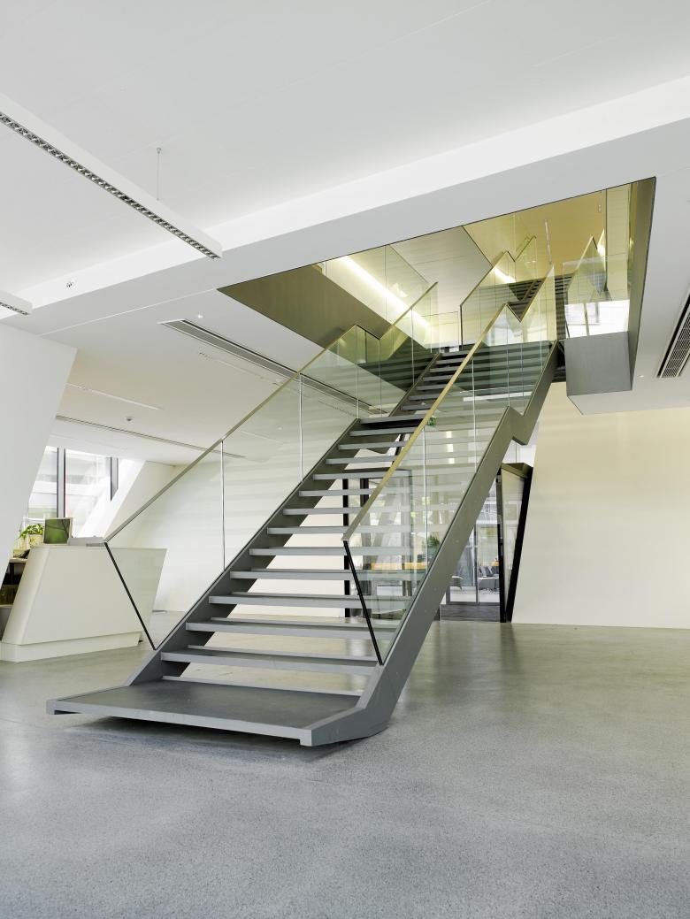 Die Gebäudehülle und die grossflächigen Wandelemente der Bereiche Gastronomie und Veranstaltungsraum bilden als Grundlayout in Anlehnung an die Dynamik der Raumelemente einen dynamisch linearen Strichcode aus. Analog zur Einrahmungsgeste des „Portals“ wird das gesamte Volumen des zentralen Gastronomiebereiches von einem raumgreifenden Decken- Wand- Sitzelement eingefasst.