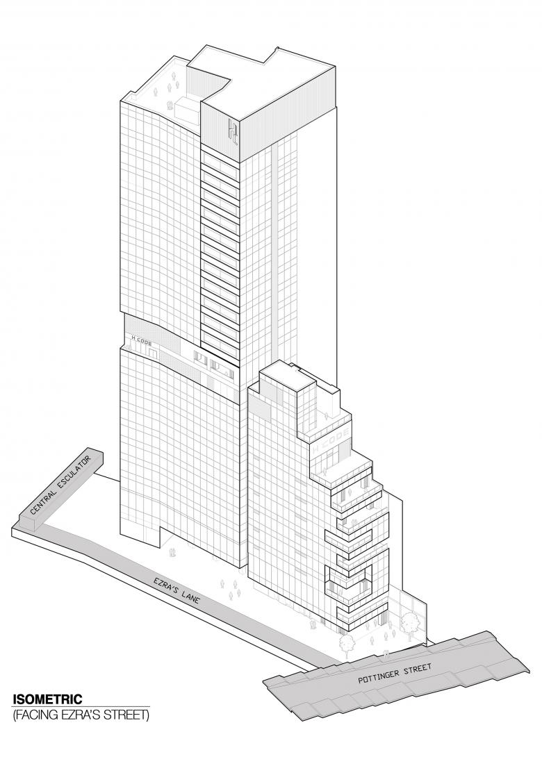 The building consists of a 10-storey low block and a 22-storey high block, and the facade is designed with texture and color to complement Tai Kwun, the new arts hub in the area. The long side of the site is along Ezra's Lane, a narrow back lane that connects Pottinger Street to Cochrane Street where the Central escalator is located. It overlooks the vibrant cityscape surrounding the Central Police Station and Tai Kwun, and blends into the diversified cultural and creative ambience in the area.