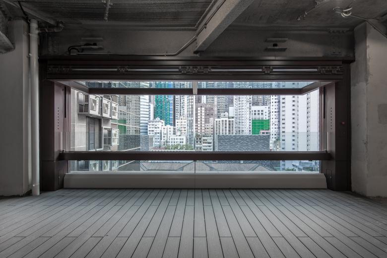 The building is designed with large folding facade and bi-fold casement garage doors to allow natural ventilation and self created terrace spaces. Various outdoor terrace spaces and rooftop open spaces provide a green environment for the neighborhood, enabling people to touch with nature in leisure time. The low block fronting Pottinger Street is set back to allow for an open terrace along the street, which creates a wide pedestrian walkway to ease urban congestion.