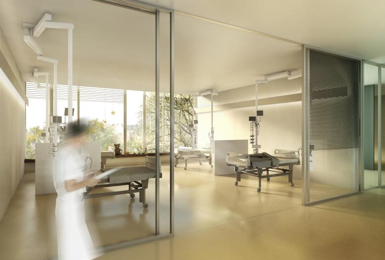 Erweiterung des Kinderspitals für die Intensivpflegestation mit 5 1 bis 4-Bett-Zimmern, Empfang, Büros, Besprechungsräumen, Aufenthalt, Notfallzufahrt