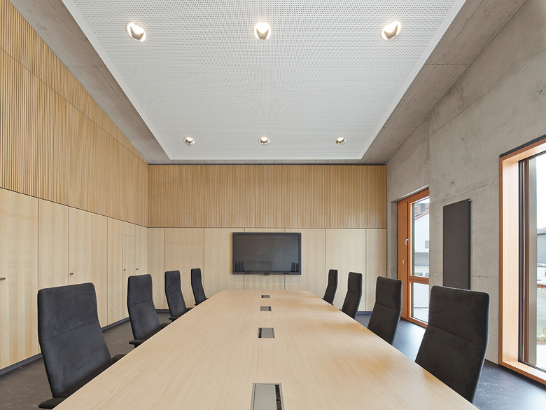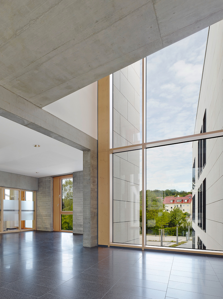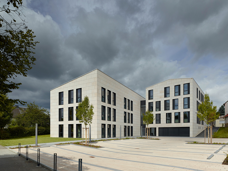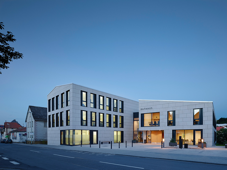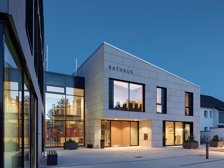 In einer Kleinstadt war im Kontext zweigeschossiger Straßenrandbebauung ein neues Rathaus zu planen. Wir verteilten das Bauvolumen auf zwei Häuser, die sich in Grundfläche und Firsthöhe, Baukörperstellung und Dachform an der umgebenden Bebauung orientieren, sich in der genauen Ausformung und Detaillierung jedoch unverkennbar modern zeigen. Die Baukörper sind zueinander leicht verdreht und in der Tiefe gestaffelt platziert, so dass sich an der Straße ein Vorplatz bildet, während sich die Gebäude im Rückbereich mit der Gartenlandschaft verzahnen. Publikumsnahe Einrichtungen wie Bürgerbüro, Trauzimmer und Gastronomie liegen am Eingang. Eine verglaste Halle zwischen den Baukörpern und ein Treppenhaus erschließen zwei Obergeschosse und ein Hanggeschoss. Kompakte Bauform, konsequente Wärmedämmung und Pellet-Heizung führen zu einem sehr günstigen Energieverbrauch (60% unter EnEV).