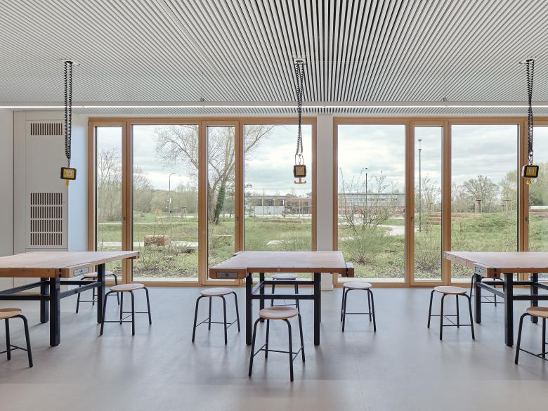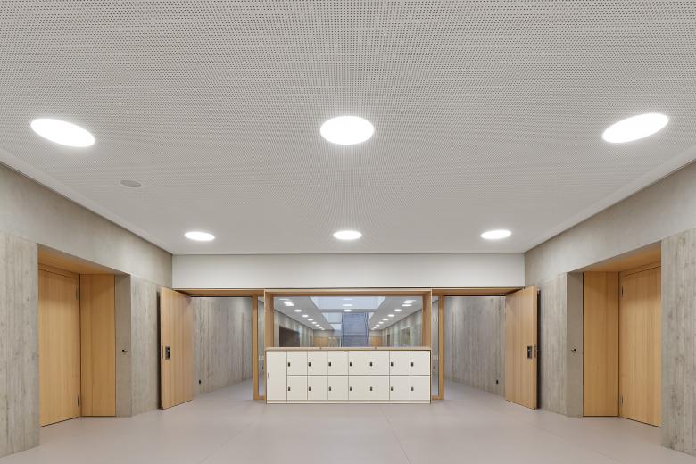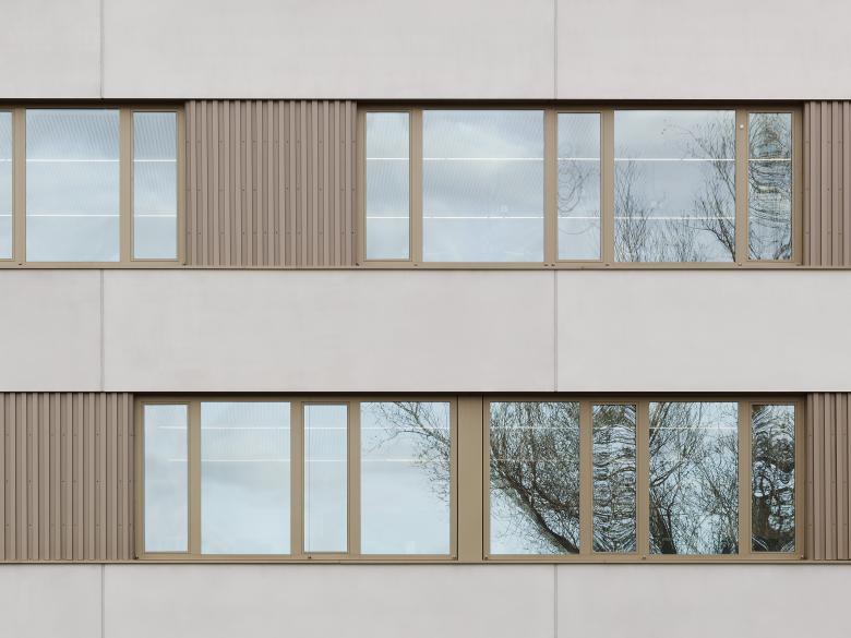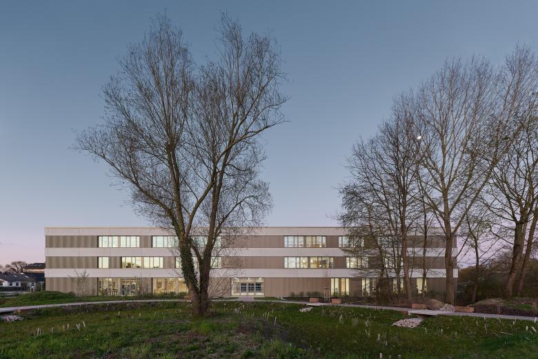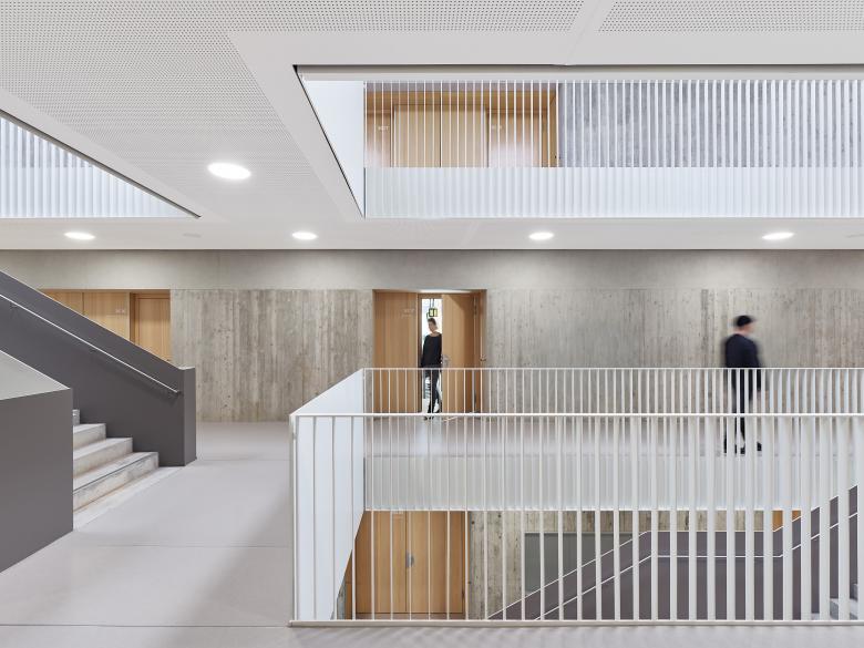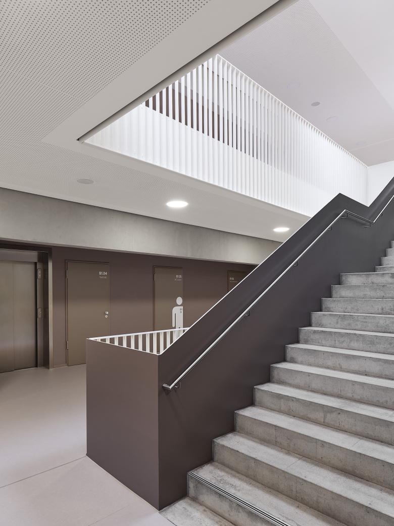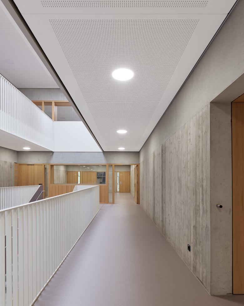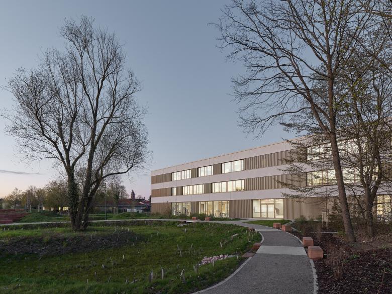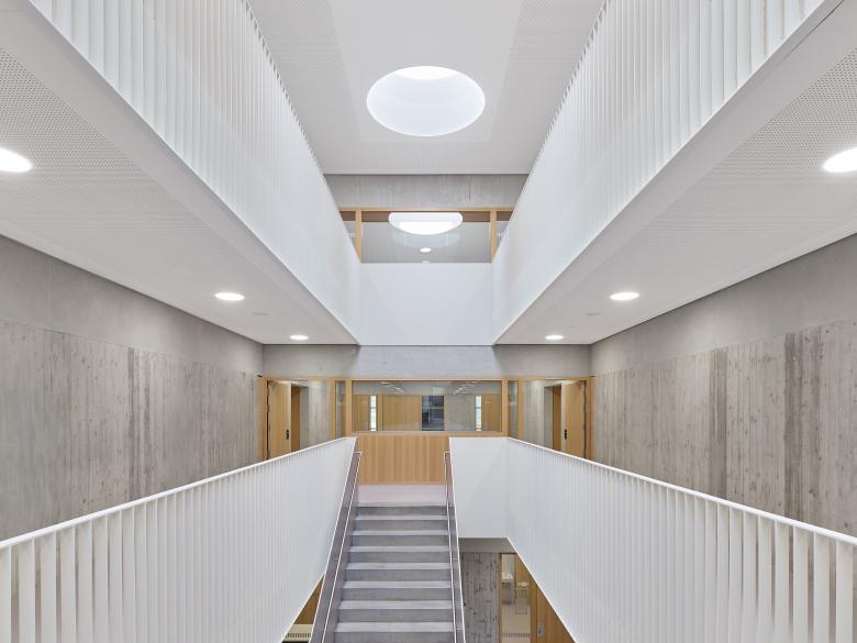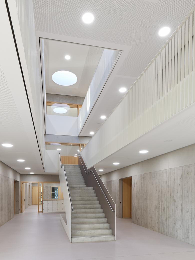Die Integrierte Gesamtschule Kandel wurde bereits vor 20 Jahren um einen Neubau mit Gymnasialklassen erweitert. Für die Fortentwicklung zu einer Integrierten Gesamtschule sollte nun ein weiterer Neubau mit ca. 3.000 qm Nutzfläche so geplant werden, dass die Schule aus den 60er Jahren während der Bauzeit noch nutzbar ist, bevor sie nach Fertigstellung des Neubaus abgerissen werden kann. Dies wurde möglich durch einen klaren, langgestreckten Baukörper, der die Raumkanten des zu erhaltenden Gebäudetrakts aufnimmt und mit ihm zusammen – nach Abbruch der Hauptschule – einen großzügigen Pausenhof fasst. Im mittig erschlossenen Neubau sind im Erdgeschoss Schulleitung, Werk- und Musikräume, im 1. Obergeschoss alle weiteren Fachklassenräume und im 2. Obergeschoss 17 Klassen- und Kursräume untergebracht. Offen geführte Treppen verbinden die drei Ebenen in einer langgestreckten Halle, an deren Enden zusätzliche Aufenthaltszonen für die Schüler angeboten werden. Ein eingeschossiges Technikbauwerk schließt den Pausenhof nach Norden zur Wohnbebauung hin ab.